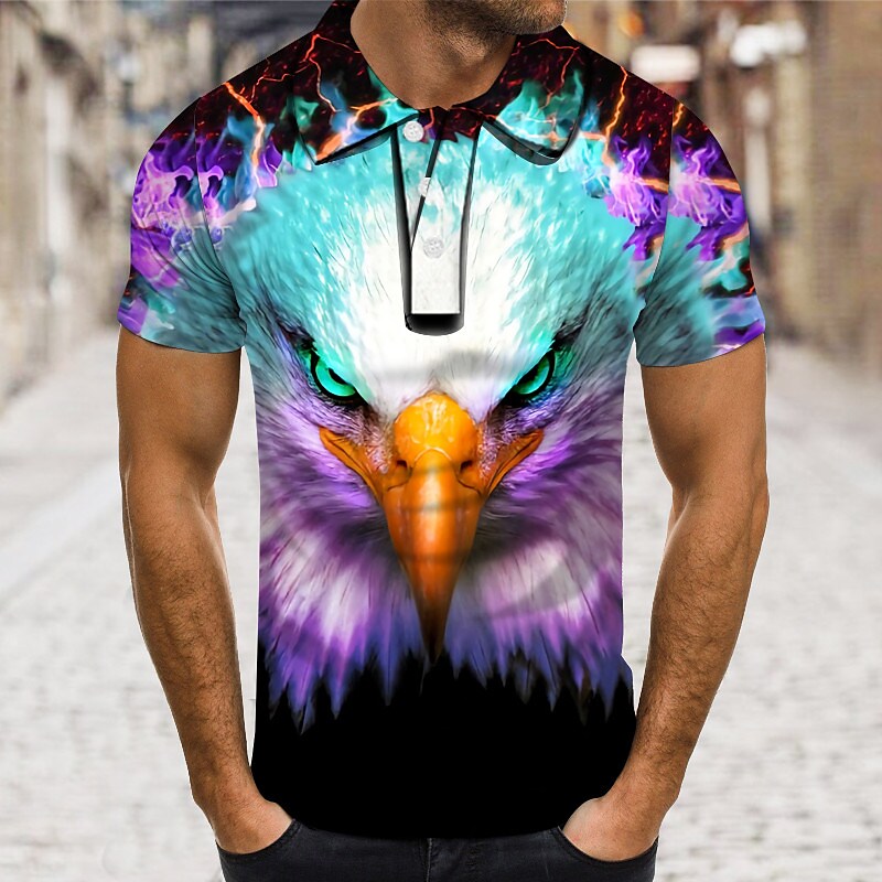 Men's Collar Polo Shirt National Flag Turndown Street Casual Short Sleeve 3D Button-Down Top