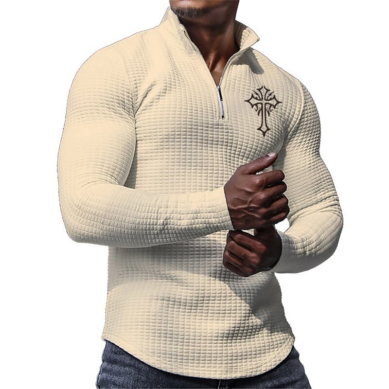 Cross Vintage Men's 3D Print Waffle Polo Shirt Zip Polo Golf Polo Outdoor Casual Daily Streetwear Waffle Fabric Long Sleeve Zip Polo Shirts Black White Blue Fall & Winter S M L Micro-elastic Lapel