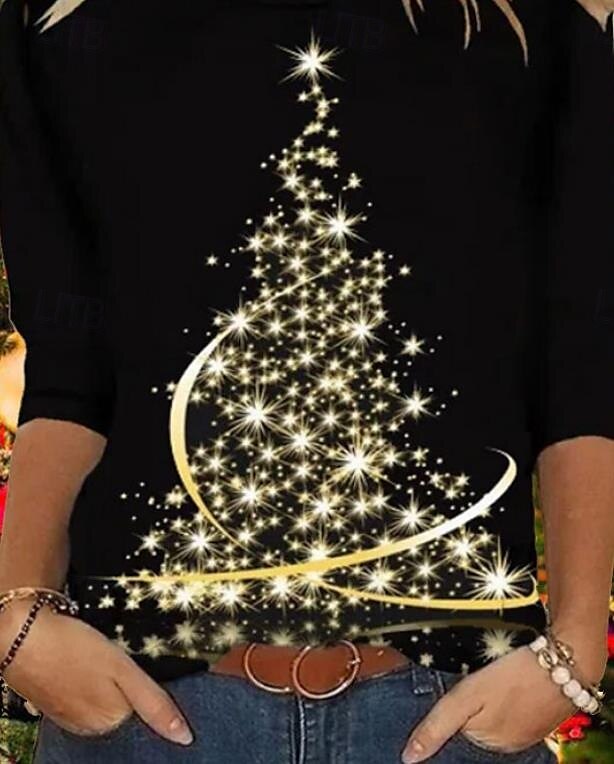 Women's Christmas Sweatshirt Long Sleeve Holiday Sparkle Tree Print Casual Round Neck Winter Black Top Comfortable Soft Clothing Warm Festive Wear